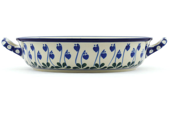 This Bleeding Heart Peacock 11" Round Baker with Handles was handmade and hand decorated in Boleslawiec, Poland by skilled artisans according to old traditional methods. This Polish stoneware is microwave, dishwasher, freezer, and oven safe up to 480°F. It does not contain lead or cadmium. It is part of the Bleeding Heart Peacock Collection.