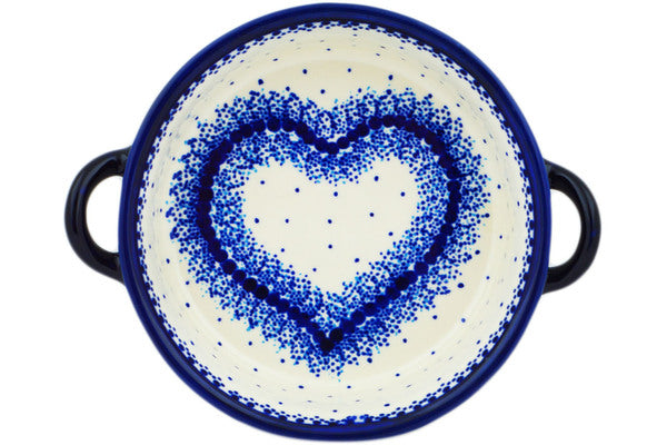 This Blue Lace Heart 6-inch Round Baker with Handles was handmade and hand decorated in Boleslawiec, Poland by skilled artisans according to old traditional methods. This Polish stoneware is microwave, dishwasher, freezer, and oven safe up to 480°F. It does not contain lead or cadmium. It is part of the Blue Lace Heart Collection.