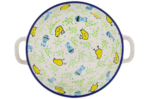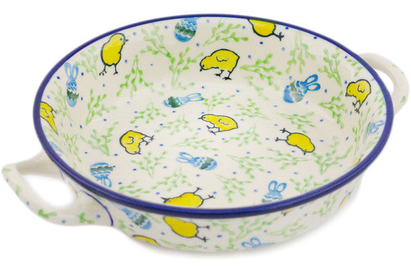 This Easter Day 6½-inch Round Baker with Handles was handmade and hand decorated in Boleslawiec, Poland by skilled artisans according to old traditional methods. This Polish stoneware is microwave, dishwasher, freezer, and oven safe up to 480°F. It does not contain lead or cadmium. It is part of the Easter Day Collection.