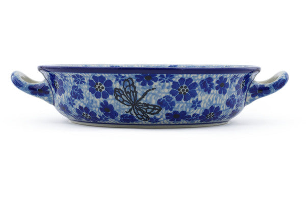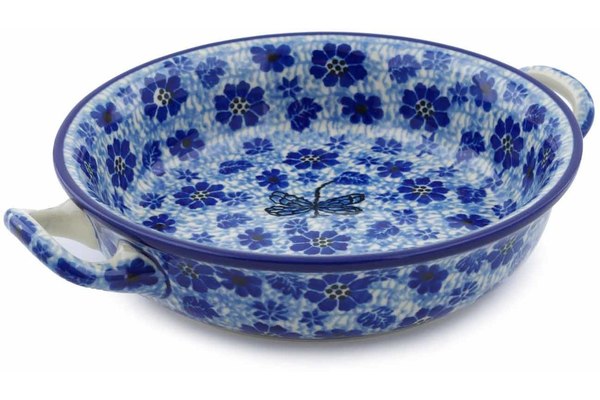 This Misty Dragonfly 6½-inch Round Baker with Handles was handmade and hand decorated in Boleslawiec, Poland by skilled artisans according to old traditional methods. This Polish stoneware is microwave, dishwasher, freezer, and oven safe up to 480°F. It does not contain lead or cadmium. It is part of the Misty Dragonfly Collection.