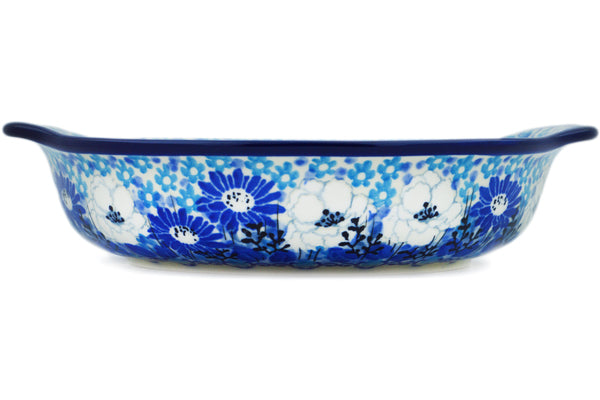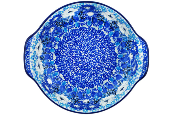 This Blue Wildflower Meadow 7" Round Baker with Handles was handmade and hand decorated in Boleslawiec, Poland by skilled artisans according to old traditional methods. This is a Polish pottery Signature Unikat, which means that it has been hand painted with both sponges and brushes and it is signed by the artist who painted it. Unikat pieces are the most intricate works of art. Larger Unikat items take hours of very careful work to finish. This Polish stoneware is microwave, dishwasher, freezer, and oven safe up to 480°F. It does not contain lead or cadmium. It is part of the Blue Wildflower Meadow Collection.
