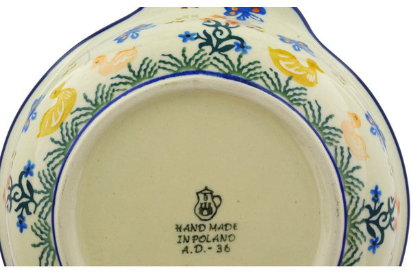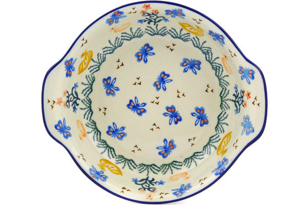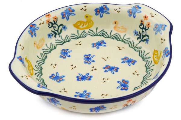 This Children's Spring 7" Round Baker with Handles was handmade and hand decorated in Boleslawiec, Poland by skilled artisans according to old traditional methods. This Polish stoneware is microwave, dishwasher, freezer, and oven safe up to 480°F. It does not contain lead or cadmium. It is part of the Children's Spring Collection.