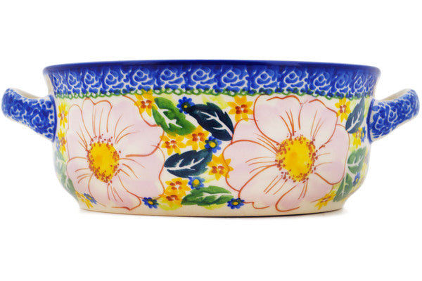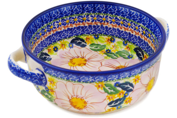 This Pink Delight 8" Round Baker with Handles was handmade and hand decorated in Boleslawiec, Poland by skilled artisans according to old traditional methods. This is a Polish pottery Signature Unikat, which means that it has been hand painted with both sponges and brushes and it is signed by the artist who painted it. Unikat pieces are the most intricate works of art. Larger Unikat items take hours of very careful work to finish. This Polish stoneware is microwave, dishwasher, freezer, and oven safe up to 480°F. It does not contain lead or cadmium. It is part of the Pink Delight Collection.