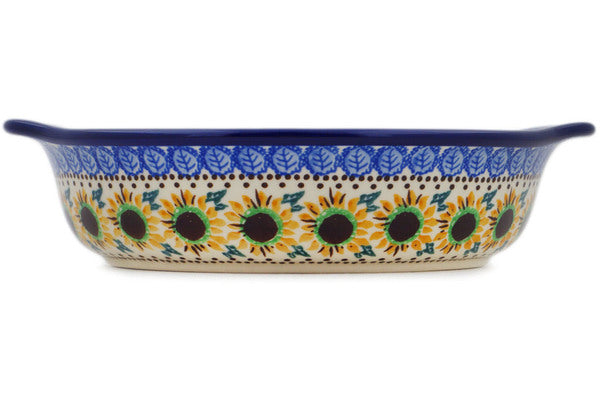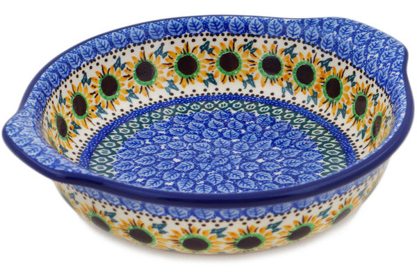 This Golden Autumn 9" Round Baker with Handles was handmade and hand decorated in Boleslawiec, Poland by skilled artisans according to old traditional methods. This is a Polish pottery Signature Unikat, which means that it has been hand painted with both sponges and brushes and it is signed by the artist who painted it. Unikat pieces are the most intricate works of art. Larger Unikat items take hours of very careful work to finish. This Polish stoneware is microwave, dishwasher, freezer, and oven safe up to 480°F. It does not contain lead or cadmium. It is part of the Golden Autumn Collection.
