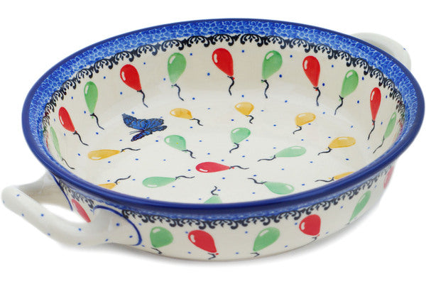 This Balloons Medium Round Baker with Handles was handmade and hand decorated in Boleslawiec, Poland by skilled artisans according to old traditional methods. This Polish stoneware is microwave, dishwasher, freezer, and oven safe up to 480°F. It does not contain lead or cadmium. It is part of the Balloons Collection.