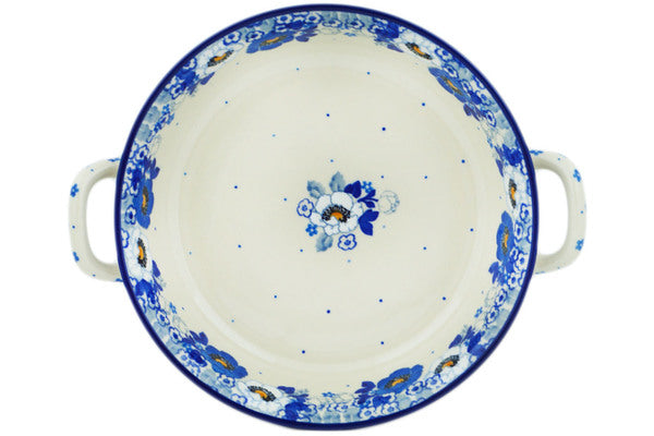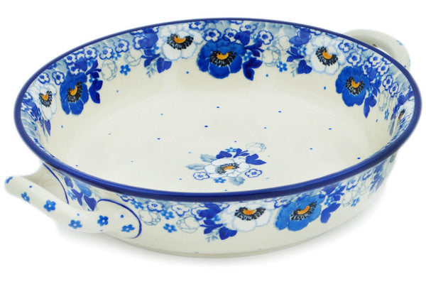 This Blue Spring Blue Medium Round Baker with Handles was handmade and hand decorated in Boleslawiec, Poland by skilled artisans according to old traditional methods. This Polish stoneware is microwave, dishwasher, freezer, and oven safe up to 480°F. It does not contain lead or cadmium. It is part of the Blue Spring Blue Collection.