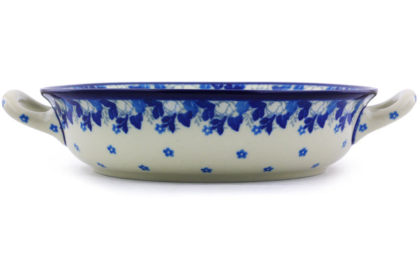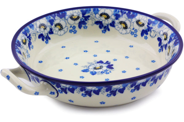 This Blue Spring Medium Round Baker with Handles was handmade and hand decorated in Boleslawiec, Poland by skilled artisans according to old traditional methods. This Polish stoneware is microwave, dishwasher, freezer, and oven safe up to 480°F. It does not contain lead or cadmium. It is part of the Blue Spring Collection.