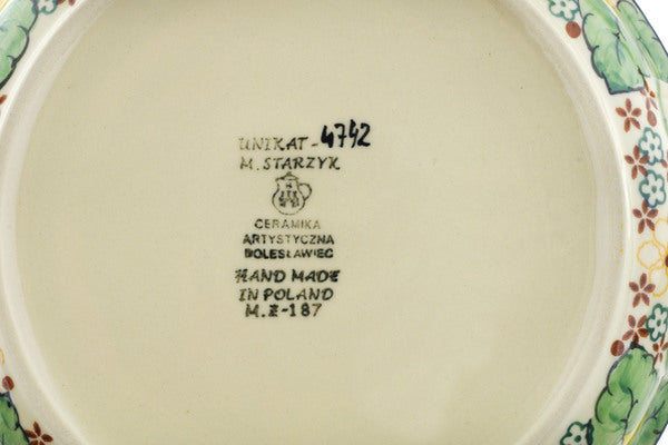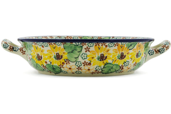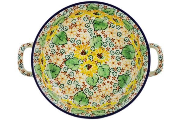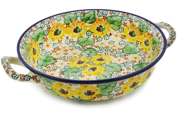 This Country Sunflower Medium Round Baker with Handles was handmade and hand decorated in Boleslawiec, Poland by skilled artisans according to old traditional methods. This is a Polish pottery Signature Unikat, which means that it has been hand painted with both sponges and brushes and it is signed by the artist who painted it. Unikat pieces are the most intricate works of art. Larger Unikat items take hours of very careful work to finish. This Polish stoneware is microwave, dishwasher, freezer, and oven safe up to 480°F. It does not contain lead or cadmium. It is part of the Country Sunflower Collection.