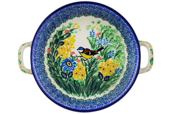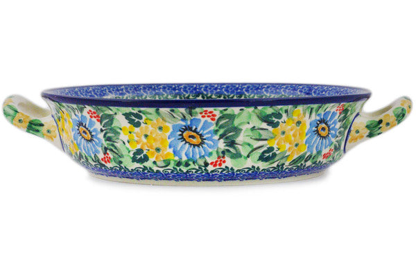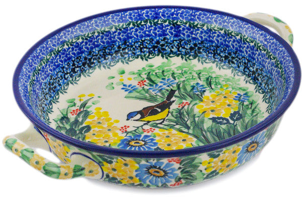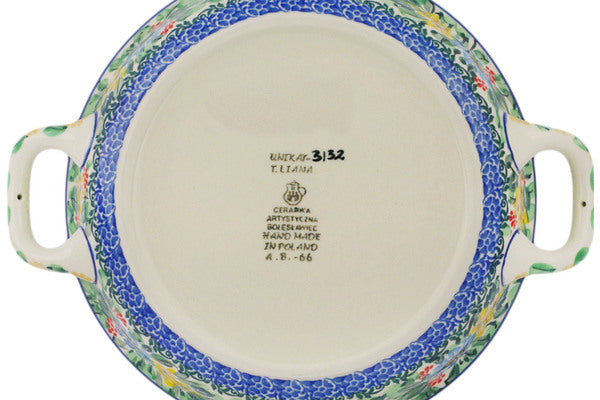 This Yellow Belly Beauty Medium Round Baker with Handles was handmade and hand decorated in Boleslawiec, Poland by skilled artisans according to old traditional methods. This is a Polish pottery Signature Unikat, which means that it has been hand painted with both sponges and brushes and it is signed by the artist who painted it. Unikat pieces are the most intricate works of art. Larger Unikat items take hours of very careful work to finish. This Polish stoneware is microwave, dishwasher, freezer, and oven safe up to 480°F. It does not contain lead or cadmium. It is part of the Yellow Belly Beauty Collection.