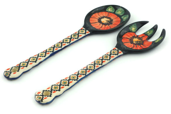 Salad Spoon and Fork Set 10" Poppy Passion Theme UNIKAT