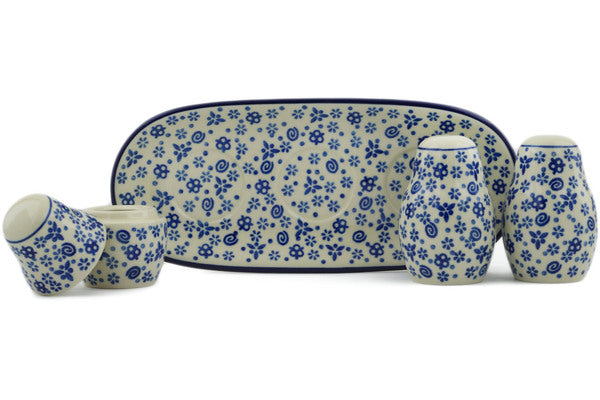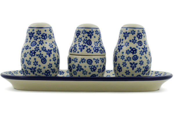 This Blue Confetti 10" Salt and Pepper with Toothpick Holder was handmade and hand decorated in Boleslawiec, Poland by skilled artisans according to old traditional methods. This Polish stoneware is microwave, dishwasher, freezer, and oven safe up to 480°F. It does not contain lead or cadmium. It is part of the Blue Confetti Collection.