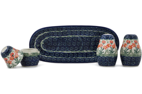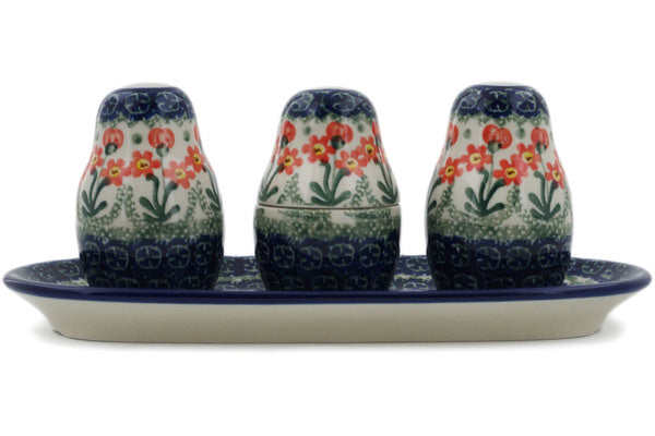This Peach Spring Daisy 10" Salt and Pepper with Toothpick Holder was handmade and hand decorated in Boleslawiec, Poland by skilled artisans according to old traditional methods. This Polish stoneware is microwave, dishwasher, freezer, and oven safe up to 480°F. It does not contain lead or cadmium. It is part of the Peach Spring Daisy Collection.