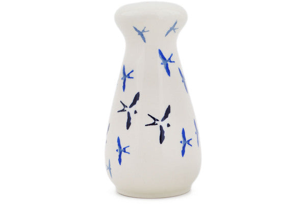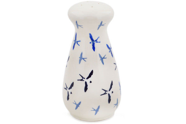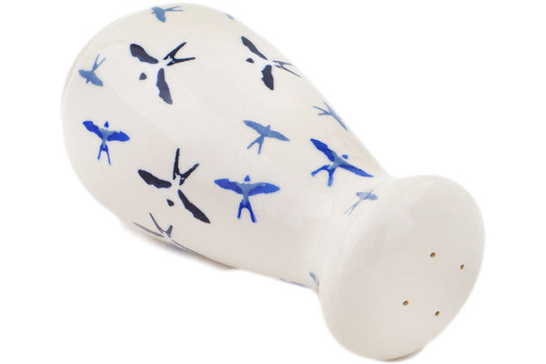 This Soaring Swallows 6" Salt Shaker was handmade and hand decorated in Boleslawiec, Poland by skilled artisans according to old traditional methods. This is a Polish pottery Signature Unikat, which means that it has been hand painted with both sponges and brushes and it is signed by the artist who painted it. Unikat pieces are the most intricate works of art. Larger Unikat items take hours of very careful work to finish. This Polish stoneware is microwave, dishwasher, freezer, and oven safe up to 480°F. It does not contain lead or cadmium. It is part of the Soaring Swallows Collection.