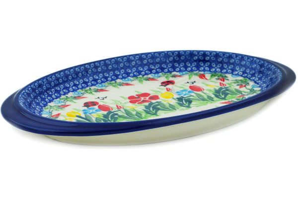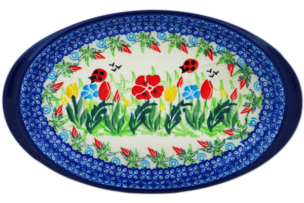 This Lady Bug Meadow 9" Saucer was handmade and hand decorated in Boleslawiec, Poland by skilled artisans according to old traditional methods. This is a Polish pottery Signature Unikat, which means that it has been hand painted with both sponges and brushes and it is signed by the artist who painted it. Unikat pieces are the most intricate works of art. Larger Unikat items take hours of very careful work to finish. This Polish stoneware is microwave, dishwasher, freezer, and oven safe up to 480°F. It does not contain lead or cadmium. It is part of the Lady Bug Meadow Collection.