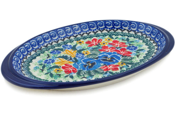This Pansy Twins 9" Saucer was handmade and hand decorated in Boleslawiec, Poland by skilled artisans according to old traditional methods. This is a Polish pottery Signature Unikat, which means that it has been hand painted with both sponges and brushes and it is signed by the artist who painted it. Unikat pieces are the most intricate works of art. Larger Unikat items take hours of very careful work to finish. This Polish stoneware is microwave, dishwasher, freezer, and oven safe up to 480°F. It does not contain lead or cadmium. It is part of the Pansy Twins Collection.