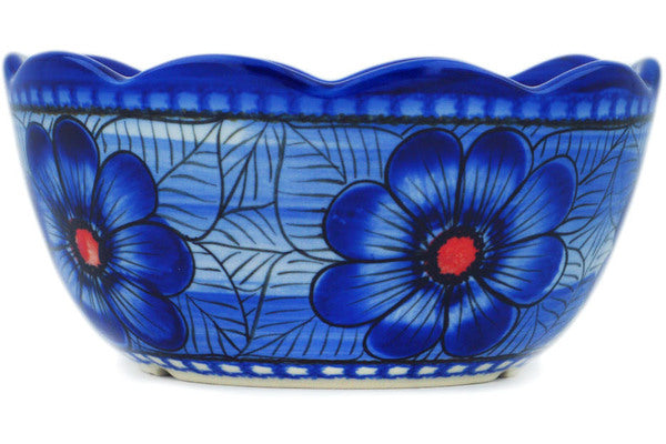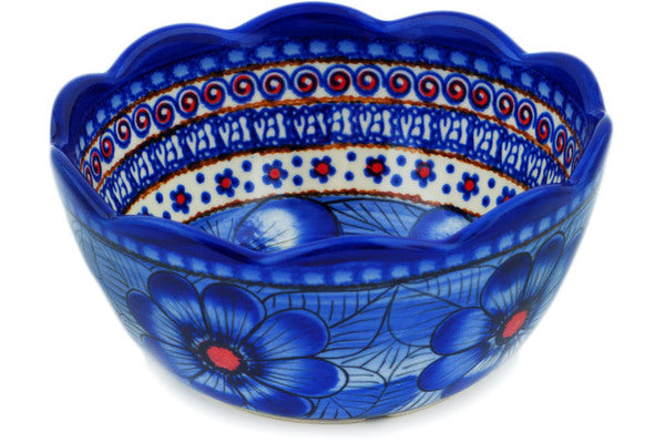 This Blue Heaven 6" Scalloped Bowl was handmade and hand decorated in Boleslawiec, Poland by skilled artisans according to old traditional methods. This is a Polish pottery Signature Unikat, which means that it has been hand painted with both sponges and brushes and it is signed by the artist who painted it. Unikat pieces are the most intricate works of art. Larger Unikat items take hours of very careful work to finish. This Polish stoneware is microwave, dishwasher, freezer, and oven safe up to 480°F. It does not contain lead or cadmium. It is part of the Blue Heaven Collection.