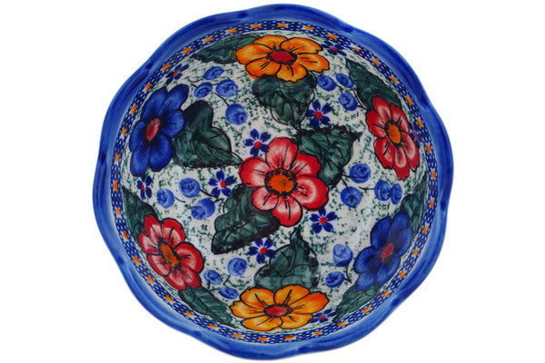 This Bold Pansy 6" Scalloped Bowl was handmade and hand decorated in Boleslawiec, Poland by skilled artisans according to old traditional methods. This is a Polish pottery Signature Unikat, which means that it has been hand painted with both sponges and brushes and it is signed by the artist who painted it. Unikat pieces are the most intricate works of art. Larger Unikat items take hours of very careful work to finish. This Polish stoneware is microwave, dishwasher, freezer, and oven safe up to 480°F. It does not contain lead or cadmium. It is part of the Bold Pansy Collection.