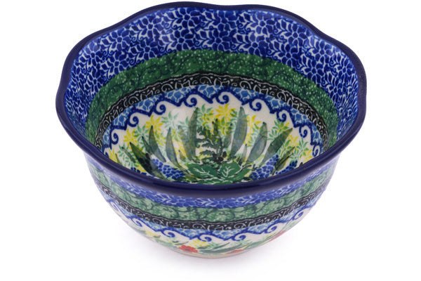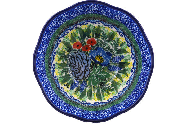 This Joyful Blue 6" Scalloped Bowl was handmade and hand decorated in Boleslawiec, Poland by skilled artisans according to old traditional methods. This is a Polish pottery Signature Unikat, which means that it has been hand painted with both sponges and brushes and it is signed by the artist who painted it. Unikat pieces are the most intricate works of art. Larger Unikat items take hours of very careful work to finish. This Polish stoneware is microwave, dishwasher, freezer, and oven safe up to 480°F. It does not contain lead or cadmium. It is part of the Joyful Blue Collection.