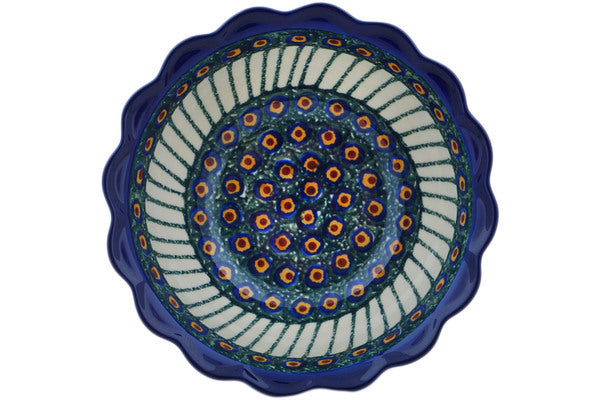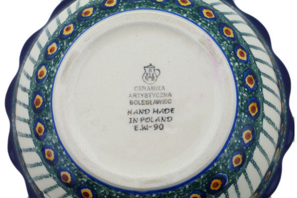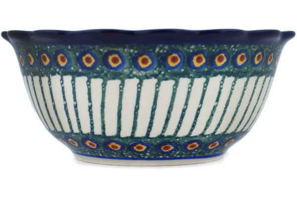This Emerald Peacock 7" Scalloped Bowl was handmade and hand decorated in Boleslawiec, Poland by skilled artisans according to old traditional methods. This Polish stoneware is microwave, dishwasher, freezer, and oven safe up to 480°F. It does not contain lead or cadmium. It is part of the Emerald Peacock Collection.
