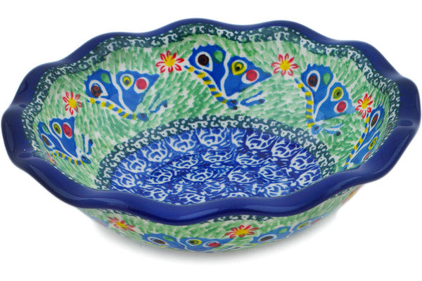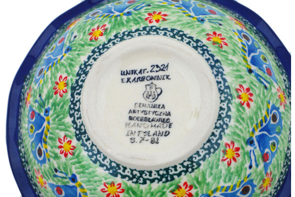 This Ring Of Flowers 7" Scalloped Bowl was handmade and hand decorated in Boleslawiec, Poland by skilled artisans according to old traditional methods. This is a Polish pottery Signature Unikat, which means that it has been hand painted with both sponges and brushes and it is signed by the artist who painted it. Unikat pieces are the most intricate works of art. Larger Unikat items take hours of very careful work to finish. This Polish stoneware is microwave, dishwasher, freezer, and oven safe up to 480°F. It does not contain lead or cadmium. It is part of the Ring Of Flowers Collection.