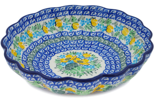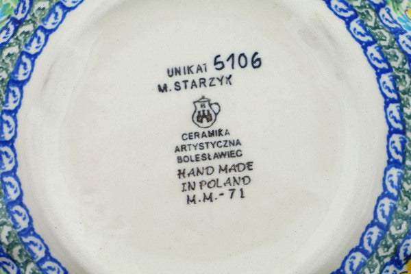 This Spring Pond 7" Scalloped Bowl was handmade and hand decorated in Boleslawiec, Poland by skilled artisans according to old traditional methods. This is a Polish pottery Signature Unikat, which means that it has been hand painted with both sponges and brushes and it is signed by the artist who painted it. Unikat pieces are the most intricate works of art. Larger Unikat items take hours of very careful work to finish. This Polish stoneware is microwave, dishwasher, freezer, and oven safe up to 480°F. It does not contain lead or cadmium. It is part of the Spring Pond Collection.