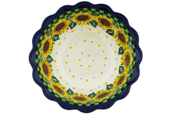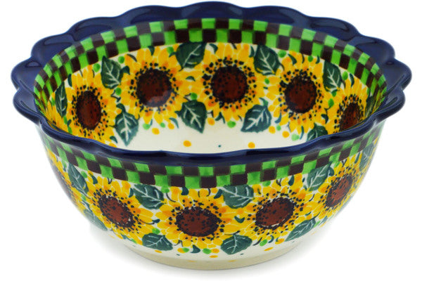This Summer Sunflower 7" Scalloped Bowl was handmade and hand decorated in Boleslawiec, Poland by skilled artisans according to old traditional methods. This is a Polish pottery Signature Unikat, which means that it has been hand painted with both sponges and brushes and it is signed by the artist who painted it. Unikat pieces are the most intricate works of art. Larger Unikat items take hours of very careful work to finish. This Polish stoneware is microwave, dishwasher, freezer, and oven safe up to 480°F. It does not contain lead or cadmium. It is part of the Summer Sunflower Collection.