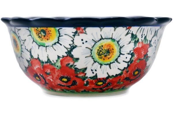 This Sweet Red Petals 7" Scalloped Bowl was handmade and hand decorated in Boleslawiec, Poland by skilled artisans according to old traditional methods. This is a Polish pottery Signature Unikat, which means that it has been hand painted with both sponges and brushes and it is signed by the artist who painted it. Unikat pieces are the most intricate works of art. Larger Unikat items take hours of very careful work to finish. This Polish stoneware is microwave, dishwasher, freezer, and oven safe up to 480°F. It does not contain lead or cadmium. It is part of the Sweet Red Petals Collection.
