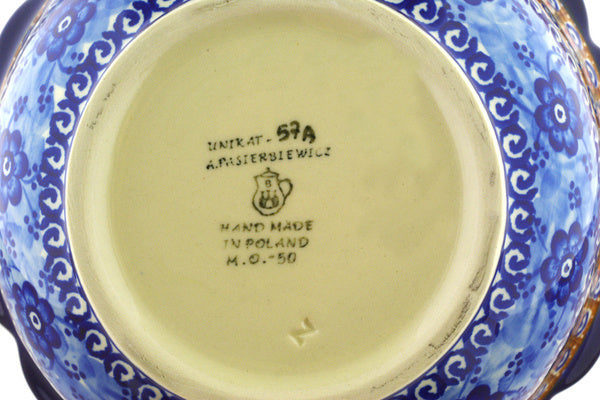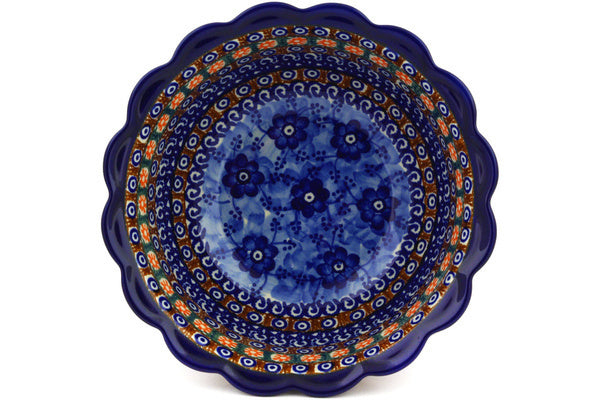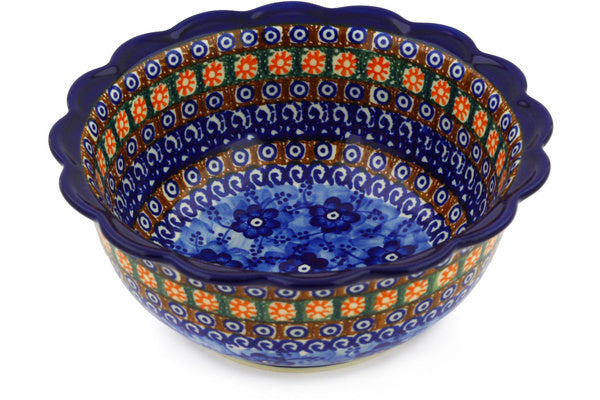 This Dancing Blue Poppies 8" Scalloped Bowl was handmade and hand decorated in Boleslawiec, Poland by skilled artisans according to old traditional methods. This is a Polish pottery Signature Unikat, which means that it has been hand painted with both sponges and brushes and it is signed by the artist who painted it. Unikat pieces are the most intricate works of art. Larger Unikat items take hours of very careful work to finish. This Polish stoneware is microwave, dishwasher, freezer, and oven safe up to 480°F. It does not contain lead or cadmium. It is part of the Dancing Blue Poppies Collection.