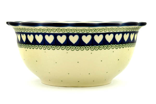This Light Hearted 9" Scalloped Bowl was handmade and hand decorated in Boleslawiec, Poland by skilled artisans according to old traditional methods. This Polish stoneware is microwave, dishwasher, freezer, and oven safe up to 480°F. It does not contain lead or cadmium. It is part of the Light Hearted Collection.