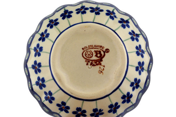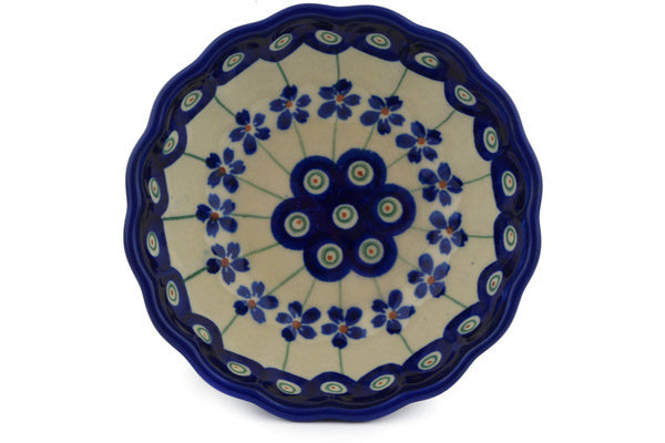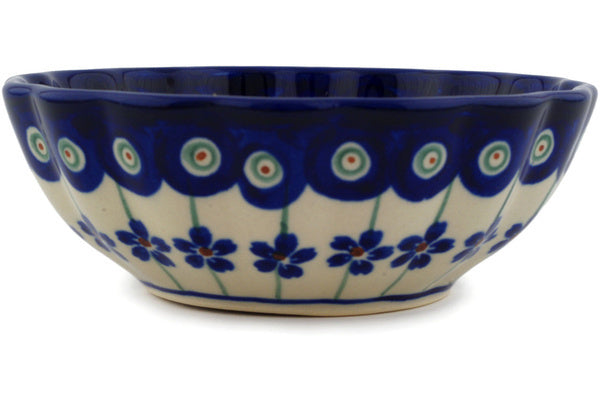 This Flowering Peacock Small Scalloped Bowl was handmade and hand decorated in Boleslawiec, Poland by skilled artisans according to old traditional methods. This Polish stoneware is microwave, dishwasher, freezer, and oven safe up to 480°F. It does not contain lead or cadmium. It is part of the Flowering Peacock Collection.