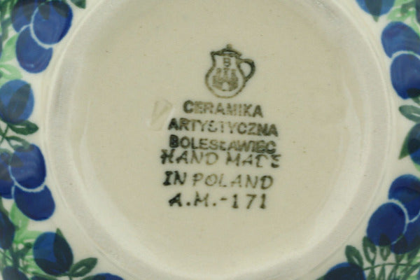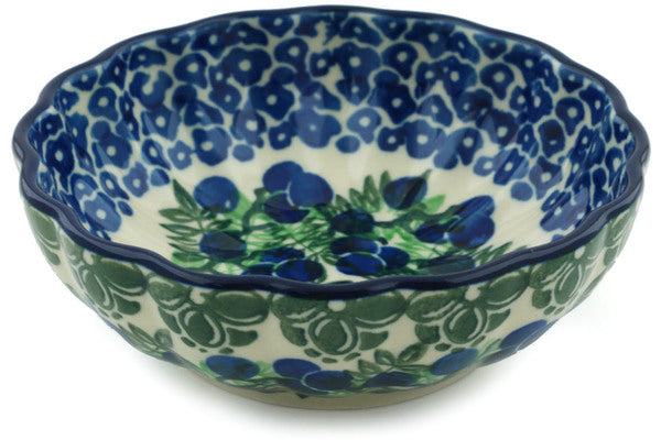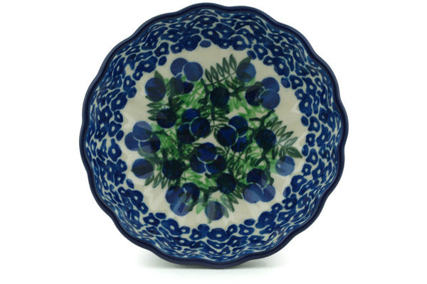 This Blueberry Fields Forever 5" Scalloped Fluted Bowl was handmade and hand decorated in Boleslawiec, Poland by skilled artisans according to old traditional methods. This Polish stoneware is microwave, dishwasher, freezer, and oven safe up to 480°F. It does not contain lead or cadmium. It is part of the Blueberry Fields Forever Collection.