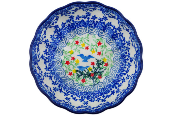 This Free Flock 5" Scalloped Fluted Bowl was handmade and hand decorated in Boleslawiec, Poland by skilled artisans according to old traditional methods. This is a Polish pottery Signature Unikat, which means that it has been hand painted with both sponges and brushes and it is signed by the artist who painted it. Unikat pieces are the most intricate works of art. Larger Unikat items take hours of very careful work to finish. This Polish stoneware is microwave, dishwasher, freezer, and oven safe up to 480°F. It does not contain lead or cadmium. It is part of the Free Flock Collection.