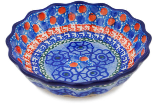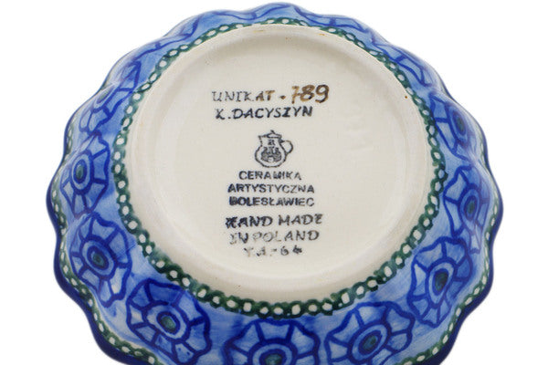 This Midnight Tango 5" Scalloped Fluted Bowl was handmade and hand decorated in Boleslawiec, Poland by skilled artisans according to old traditional methods. This is a Polish pottery Signature Unikat, which means that it has been hand painted with both sponges and brushes and it is signed by the artist who painted it. Unikat pieces are the most intricate works of art. Larger Unikat items take hours of very careful work to finish. This Polish stoneware is microwave, dishwasher, freezer, and oven safe up to 480°F. It does not contain lead or cadmium. It is part of the Midnight Tango Collection.