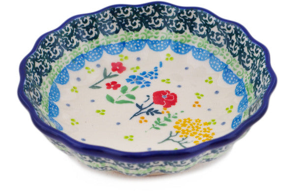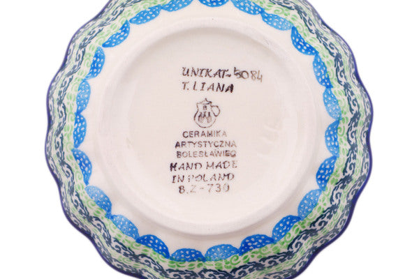 This Sunday Morning 5" Scalloped Fluted Bowl was handmade and hand decorated in Boleslawiec, Poland by skilled artisans according to old traditional methods. This is a Polish pottery Signature Unikat, which means that it has been hand painted with both sponges and brushes and it is signed by the artist who painted it. Unikat pieces are the most intricate works of art. Larger Unikat items take hours of very careful work to finish. This Polish stoneware is microwave, dishwasher, freezer, and oven safe up to 480°F. It does not contain lead or cadmium. It is part of the Sunday Morning Collection.