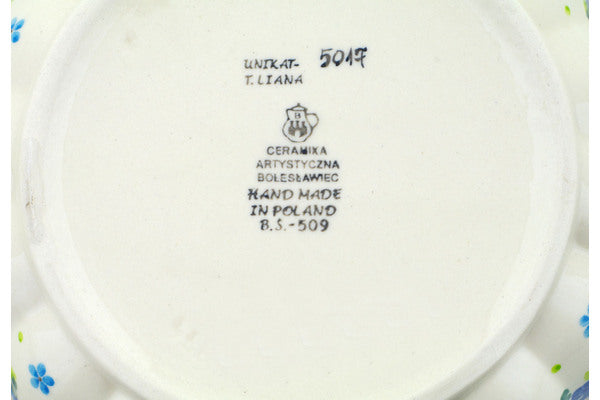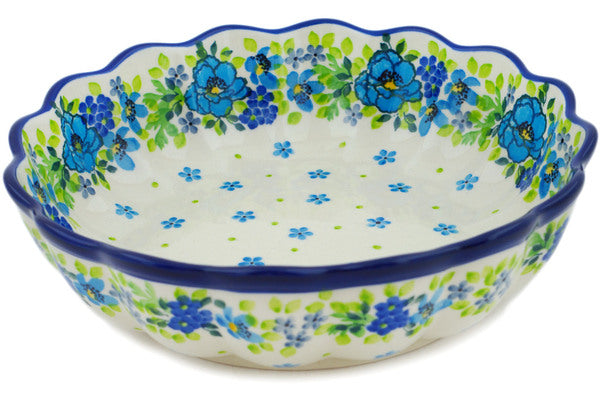 This Blue Kissed Petals 8" Scalloped Fluted Bowl was handmade and hand decorated in Boleslawiec, Poland by skilled artisans according to old traditional methods. This is a Polish pottery Signature Unikat, which means that it has been hand painted with both sponges and brushes and it is signed by the artist who painted it. Unikat pieces are the most intricate works of art. Larger Unikat items take hours of very careful work to finish. This Polish stoneware is microwave, dishwasher, freezer, and oven safe up to 480°F. It does not contain lead or cadmium. It is part of the Blue Kissed Petals Collection.