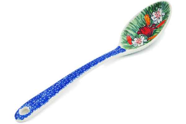 This Scarlet Flora 13" Serving Spoon was handmade and hand decorated in Boleslawiec, Poland by skilled artisans according to old traditional methods. This is a Polish pottery Signature Unikat, which means that it has been hand painted with both sponges and brushes and it is signed by the artist who painted it. Unikat pieces are the most intricate works of art. Larger Unikat items take hours of very careful work to finish. This Polish stoneware is microwave, dishwasher, freezer, and oven safe up to 480°F. It does not contain lead or cadmium. It is part of the Scarlet Flora Collection.