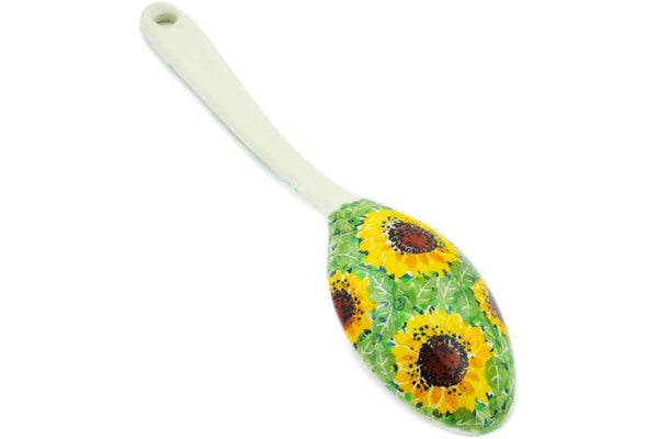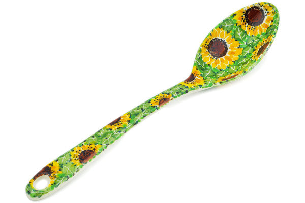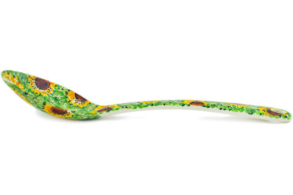 This Sunflower Bliss 13" Serving Spoon was handmade and hand decorated in Boleslawiec, Poland by skilled artisans according to old traditional methods. This is a Polish pottery Signature Unikat, which means that it has been hand painted with both sponges and brushes and it is signed by the artist who painted it. Unikat pieces are the most intricate works of art. Larger Unikat items take hours of very careful work to finish. This Polish stoneware is microwave, dishwasher, freezer, and oven safe up to 480°F. It does not contain lead or cadmium. It is part of the Sunflower Bliss Collection.