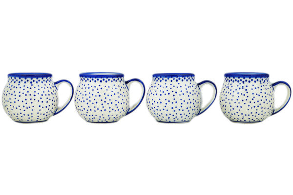 This Rain Of Dots Set of 4 12oz Mugs was handmade and hand decorated in Boleslawiec, Poland by skilled artisans according to old traditional methods. This is a Polish pottery Signature Unikat, which means that it has been hand painted with both sponges and brushes and it is signed by the artist who painted it. Unikat pieces are the most intricate works of art. Larger Unikat items take hours of very careful work to finish. This Polish stoneware is microwave, dishwasher, freezer, and oven safe up to 480°F. It does not contain lead or cadmium. It is part of the Rain Of Dots Collection.