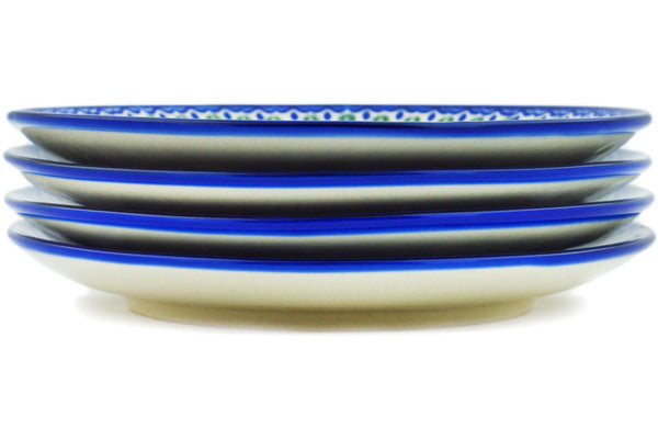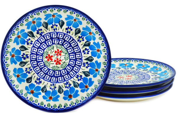 This Pansy Morning Set of 4 dessert plates was handmade and hand decorated in Boleslawiec, Poland by skilled artisans according to old traditional methods. This Polish stoneware is microwave, dishwasher, freezer, and oven safe up to 480°F. It does not contain lead or cadmium. It is part of the Pansy Morning Collection.