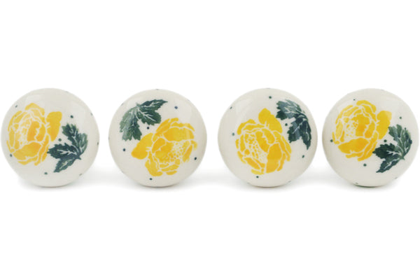 This Yellow Rose Set of 4 Drawer Pull Knobs 1-1/2 inch was handmade and hand decorated in Boleslawiec, Poland by skilled artisans according to old traditional methods. This Polish stoneware is microwave, dishwasher, freezer, and oven safe up to 480°F. It does not contain lead or cadmium. It is part of the Yellow Rose Collection.