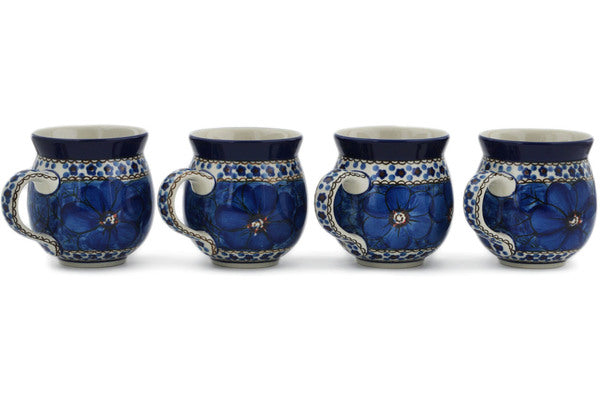 This Cobalt Poppies Set of Four 12 oz Bubble Mugs was handmade and hand decorated in Boleslawiec, Poland by skilled artisans according to old traditional methods. This is a Polish pottery Signature Unikat, which means that it has been hand painted with both sponges and brushes and it is signed by the artist who painted it. Unikat pieces are the most intricate works of art. Larger Unikat items take hours of very careful work to finish. This Polish stoneware is microwave, dishwasher, freezer, and oven safe up to 480°F. It does not contain lead or cadmium. It is part of the Cobalt Poppies Collection.