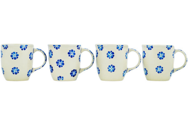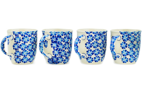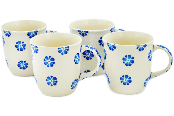 This Tropical Blues Set of Four 12oz Mugs was handmade and hand decorated in Boleslawiec, Poland by skilled artisans according to old traditional methods. This Polish stoneware is microwave, dishwasher, freezer, and oven safe up to 480°F. It does not contain lead or cadmium. It is part of the Tropical Blues Collection.