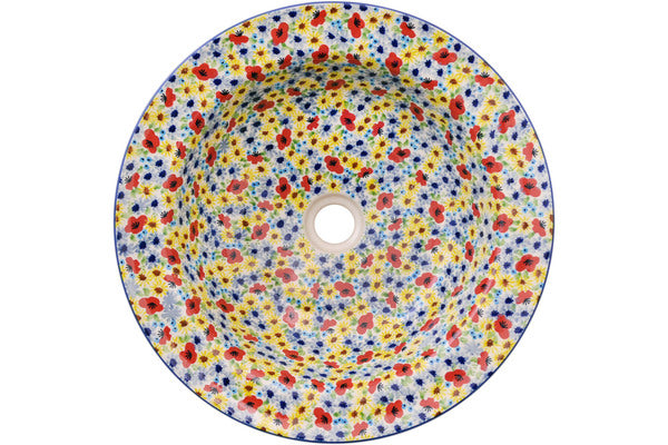 This Winter To Spring 16" Sink Bowl was handmade and hand decorated in Boleslawiec, Poland by skilled artisans according to old traditional methods. This is a Polish pottery Signature Unikat, which means that it has been hand painted with both sponges and brushes and it is signed by the artist who painted it. Unikat pieces are the most intricate works of art. Larger Unikat items take hours of very careful work to finish. This Polish stoneware is microwave, dishwasher, freezer, and oven safe up to 480°F. It does not contain lead or cadmium. It is part of the Winter To Spring Collection.
