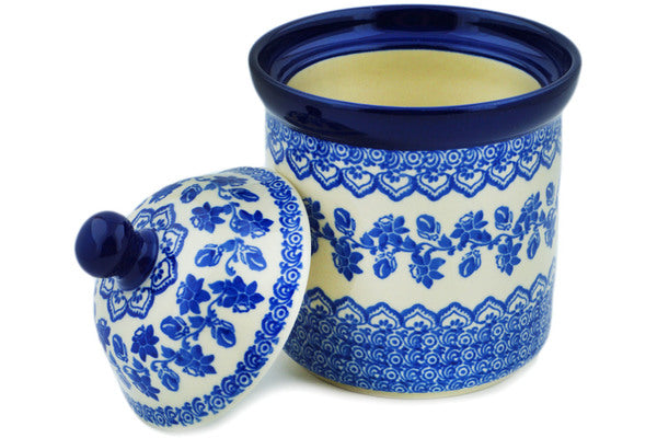 This Forget-Me-Not Summer Wreath 6" Small Canister 6" was handmade and hand decorated in Boleslawiec, Poland by skilled artisans according to old traditional methods. This Polish stoneware is microwave, dishwasher, freezer, and oven safe up to 480°F. It does not contain lead or cadmium. It is part of the Forget-Me-Not Summer Wreath Collection.