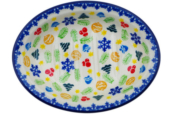 This Winter Sprinkles 5" Soap Dish was handmade and hand decorated in Boleslawiec, Poland by skilled artisans according to old traditional methods. This is a Polish pottery Signature Unikat, which means that it has been hand painted with both sponges and brushes and it is signed by the artist who painted it. Unikat pieces are the most intricate works of art. Larger Unikat items take hours of very careful work to finish. This Polish stoneware is microwave, dishwasher, freezer, and oven safe up to 480°F. It does not contain lead or cadmium. It is part of the Winter Sprinkles Collection.
