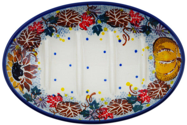 This Autumn Falling Leaves 6" Soap Dish was handmade and hand decorated in Boleslawiec, Poland by skilled artisans according to old traditional methods. This is a Polish pottery Signature Unikat, which means that it has been hand painted with both sponges and brushes and it is signed by the artist who painted it. Unikat pieces are the most intricate works of art. Larger Unikat items take hours of very careful work to finish. This Polish stoneware is microwave, dishwasher, freezer, and oven safe up to 480°F. It does not contain lead or cadmium. It is part of the Autumn Falling Leaves Collection.