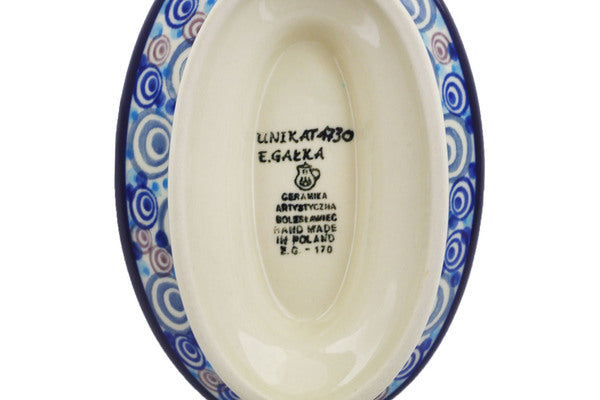 This Hypnotized 6" Soap Dish was handmade and hand decorated in Boleslawiec, Poland by skilled artisans according to old traditional methods. This is a Polish pottery Signature Unikat, which means that it has been hand painted with both sponges and brushes and it is signed by the artist who painted it. Unikat pieces are the most intricate works of art. Larger Unikat items take hours of very careful work to finish. This Polish stoneware is microwave, dishwasher, freezer, and oven safe up to 480°F. It does not contain lead or cadmium. It is part of the Hypnotized Collection.