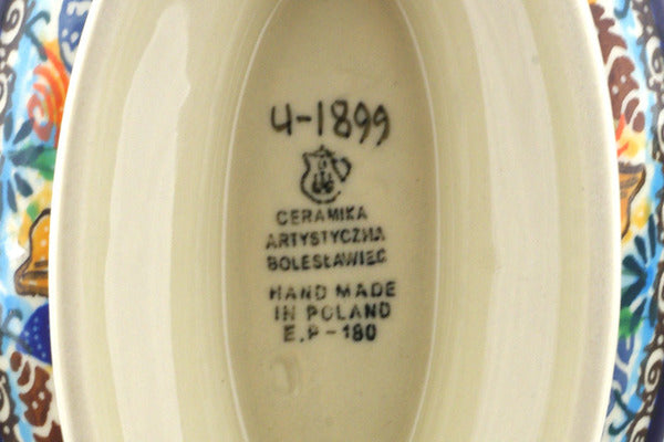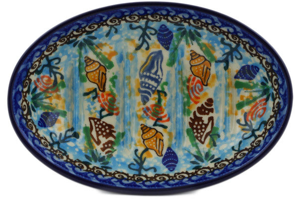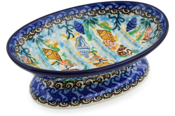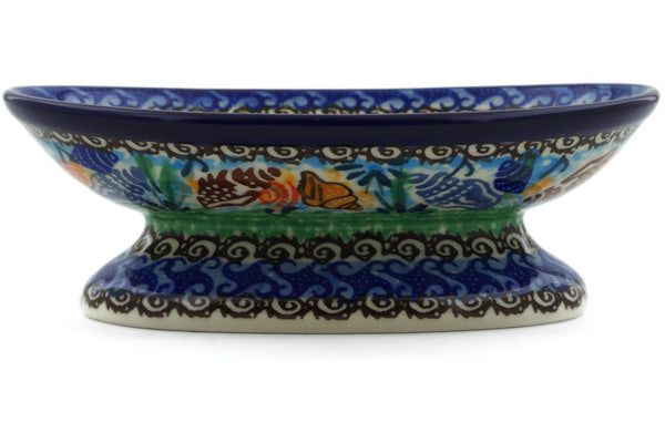 This Ocean Whisper 6" Soap Dish was handmade and hand decorated in Boleslawiec, Poland by skilled artisans according to old traditional methods. This is a Polish pottery Signature Unikat, which means that it has been hand painted with both sponges and brushes and it is signed by the artist who painted it. Unikat pieces are the most intricate works of art. Larger Unikat items take hours of very careful work to finish. This Polish stoneware is microwave, dishwasher, freezer, and oven safe up to 480°F. It does not contain lead or cadmium. It is part of the Ocean Whisper Collection.
