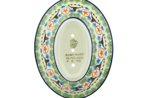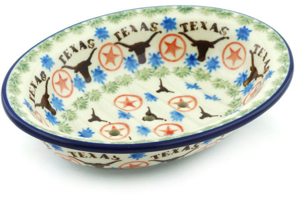 This State Of Texas 6" Soap Dish was handmade and hand decorated in Boleslawiec, Poland by skilled artisans according to old traditional methods. This Polish stoneware is microwave, dishwasher, freezer, and oven safe up to 480°F. It does not contain lead or cadmium. It is part of the State Of Texas Collection.