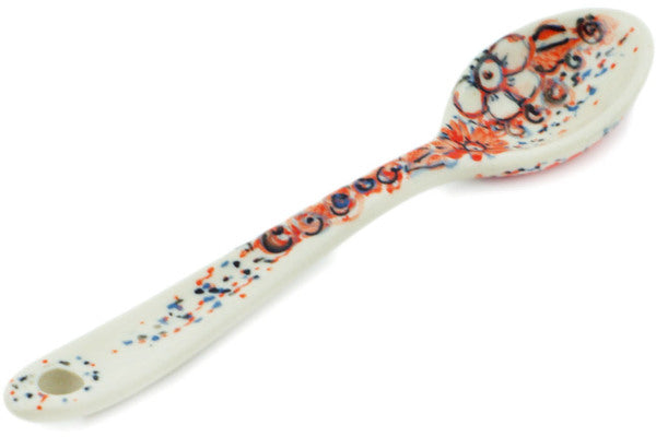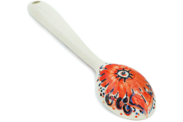 This Peachy Keen 5" Sugar Spoon was handmade and hand decorated in Boleslawiec, Poland by skilled artisans according to old traditional methods. This is a Polish pottery Signature Unikat, which means that it has been hand painted with both sponges and brushes and it is signed by the artist who painted it. Unikat pieces are the most intricate works of art. Larger Unikat items take hours of very careful work to finish. This Polish stoneware is microwave, dishwasher, freezer, and oven safe up to 480°F. It does not contain lead or cadmium. It is part of the Peachy Keen Collection.